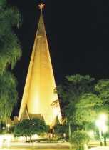 "Maringá é uma jovem cidade fundada no dia 10 de maio de 1947. Tem hoje cerca de 300 mil habitantes. Localiza-se a 400km de Curitiba (capital do estado), 400km de Foz do Iguaçu (fronteira com o Paraguai e Argentina), 620km de São Paulo. A economia local tem sua base principal no agronegócio (café, soja, algodão, trigo, pecuária), contando ainda com expressivo parque industrial. A cidade é também um importante pólo cultural, com cerca de 30 mil estudantes universitários. O monumento mais importante é a Catedral-Basílica de Nossa Senhora da Glória, em forma de cone, com 124m de altura. As ruas, avenidas e praças são fartamente arborizadas.